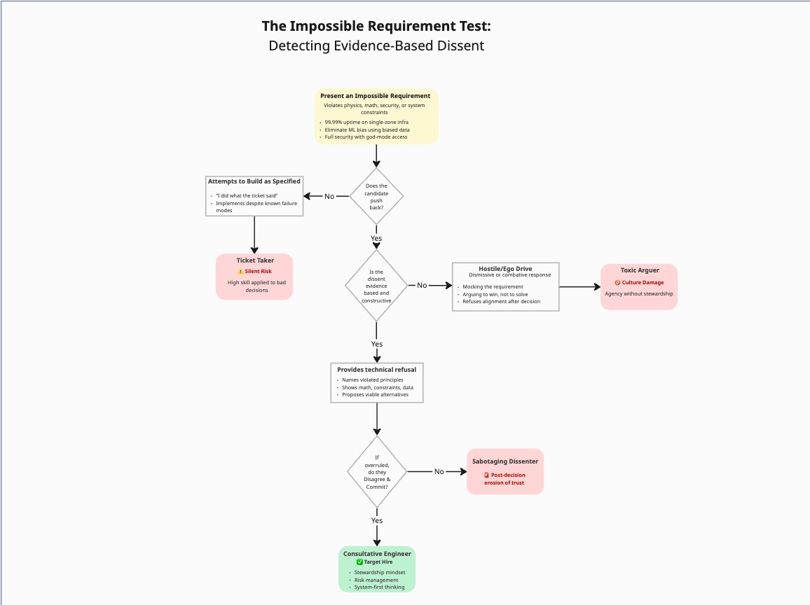 What to do: Present candidates with technically impossible requirements during system design interviews and test whether they push back with evidence or attempt to build it anyway. This reveals the critical difference between “ticket takers” who execute any instruction versus “stewards” who protect the organization from its own bad decisions.