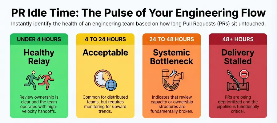 PR idle time measures how long a pull request sits open with zero review activity. Not how long the review takes. How long the code waits before anyone touches it at all.