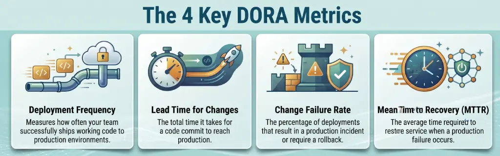 DORA (DevOps Research and Assessment) is a research program backed by Google Cloud that has studied tens of thousands of engineering teams since 2013. It produced four metrics that function as a universal health score for any engineering operation.