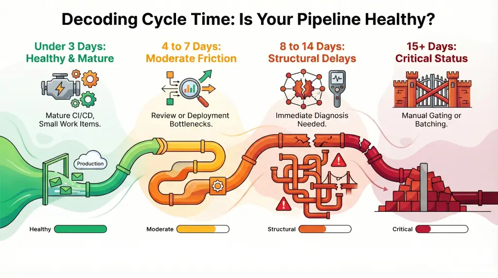 Cycle Time Time from first commit to production deployment Reveals the true speed of your delivery pipeline