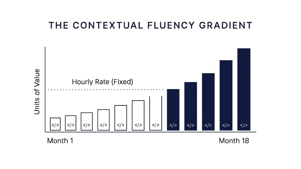 Context isn’t present at the engagement start. It’s acquired over time. The hourly rate is a vanity metric. The only metric that impacts P&L is Total Cost of Ownership (TCO) per unit of delivered functionality.