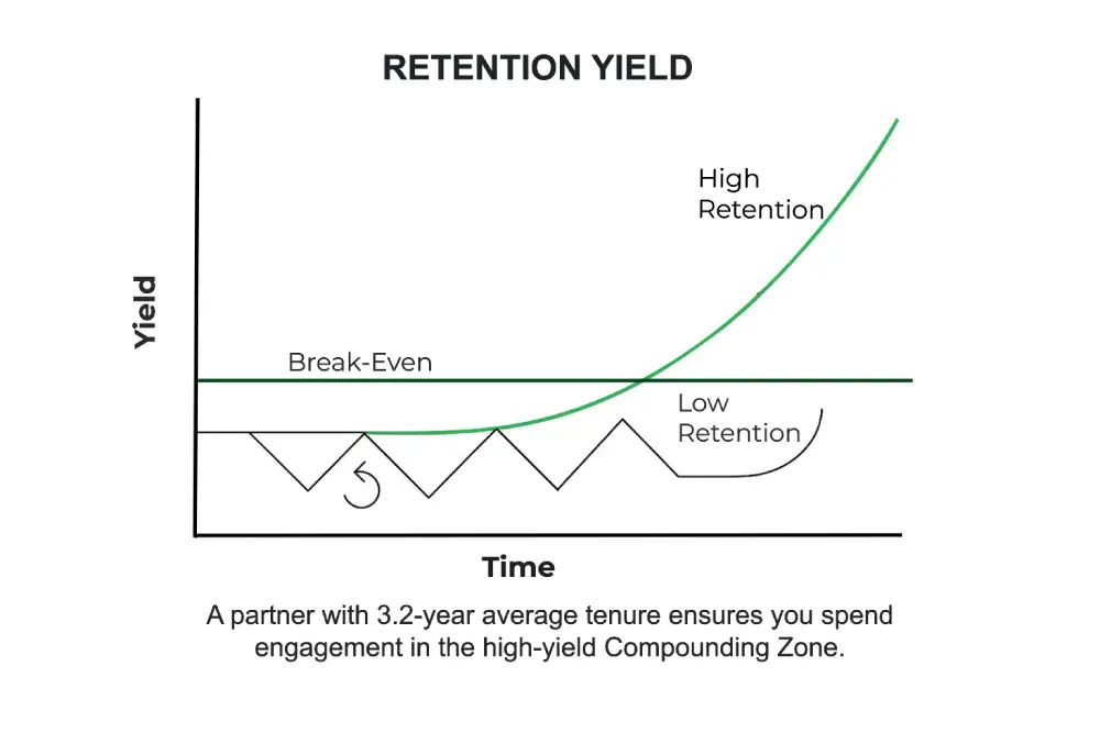 Retention is the only mechanism that captures Dividend and Compounding Zones. A partner with 3.2-year average tenure ensures you spend most engagement in the high-yield Compounding Zone.